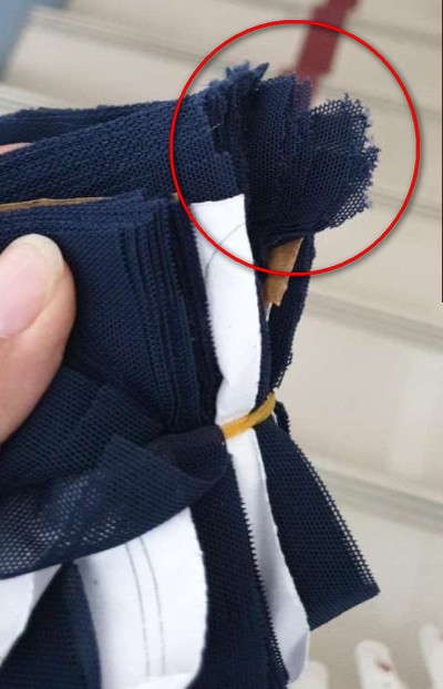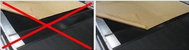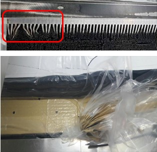如底紙未完全涵蓋左右邊條與齒條, 此舉造成底紙於機台運行時堆擠, 且塑膜同時卡在鬃毛磚槽. 強烈建議更換底紙尺寸, 底紙需涵蓋左右邊條與齒條, 並免造成齒條毀損. 一旦齒條損壞, 鬃毛磚將會嚴重損耗並縮短使用壽命.