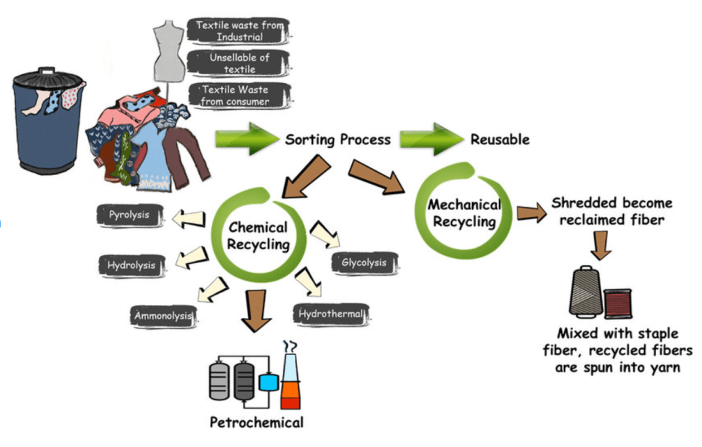 這些成衣可以是捐贈的二手衣物(某些品牌網站上也鼓勵消費者回收該品牌舊衣)、不再使用的舊衣或者回收的廢棄服裝。接著將收集到的成衣進行處理,去除非織物的部分與有污漬或損壞的布料,並將不同種類的布料進行分類處理。最後將成衣切割成小塊或碎片,然後打散成纖維。將打散的纖維重新加入紗線裡然後進行織造,製成成衣回收再生布料。由於此回收成本較高,產量小,佔整體成衣回收紗約30%。