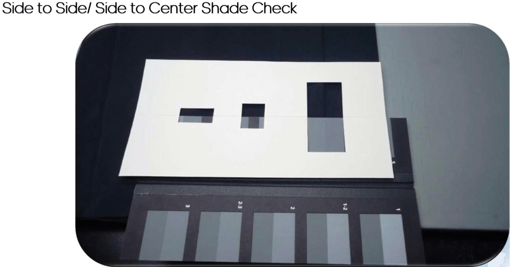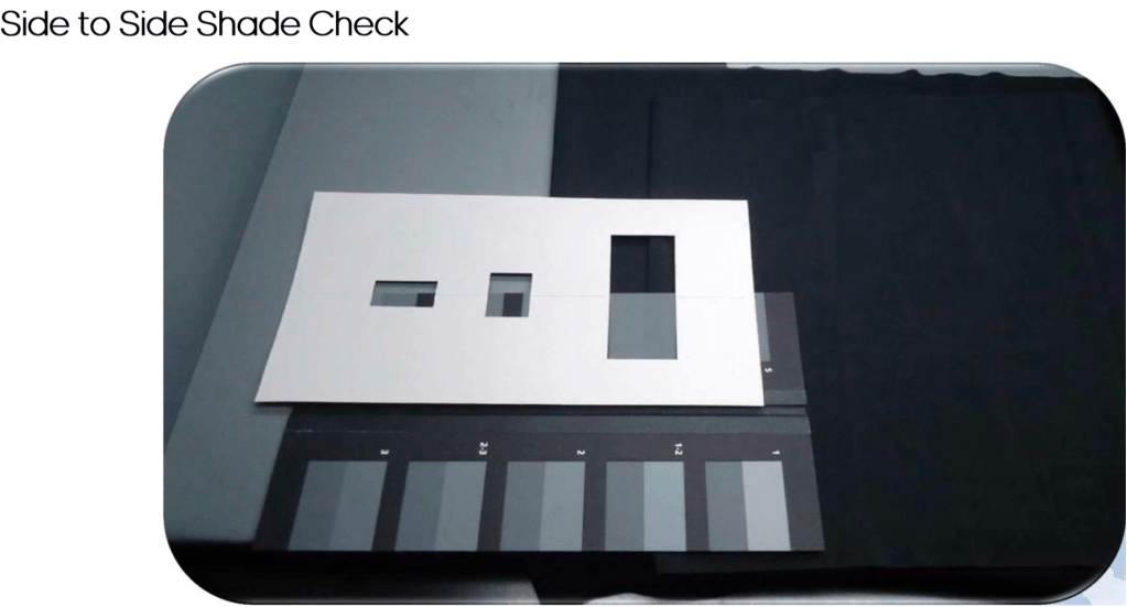 2. 布料供應商有義務在生產結束時依照美標4 分制度對所有布料進行 100% 的品質檢查。織物檢驗必須在適當的檢驗機器上進行,其照明度與整個織物幅寬相等且不低於 30 lux。布料正面一定需要檢驗,顏色色差判定須以灰階色卡為準,需達到4-5級,檢驗方式如下: