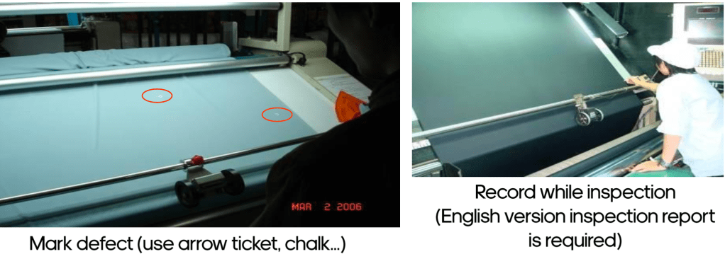 所有根據先前的評分系統可接受的缺陷都必須標記(長度不超過 0.8 英吋)。捲起布料時位於右邊邊緣。並在織物上用可擦拭的粉筆額外圈起來。任何品質問題,布料供應商必須更換,布料供應商必須承擔所有費用,成衣廠無需支付任何費用。