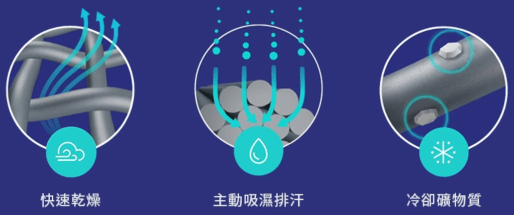 礦物冷卻(Cooling Minerals): 在纖維中嵌入天然冷卻礦物,提供即時的涼感效果。