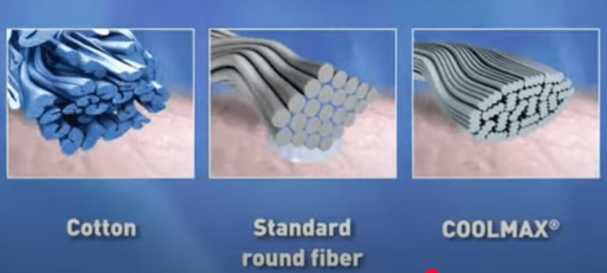 Coolmax®是以英威達專利的四條排汗管道纖維所製成,又可以稱之為「四管道特殊型聚酯纖維」,纖維的表面有四道溝槽,表面積也較一般圓形纖維多20%,沿著纖維的表面所運作的毛細管作用,在身體開始發汗的時候,就能迅速將溼氣從皮膚排至材質表層。