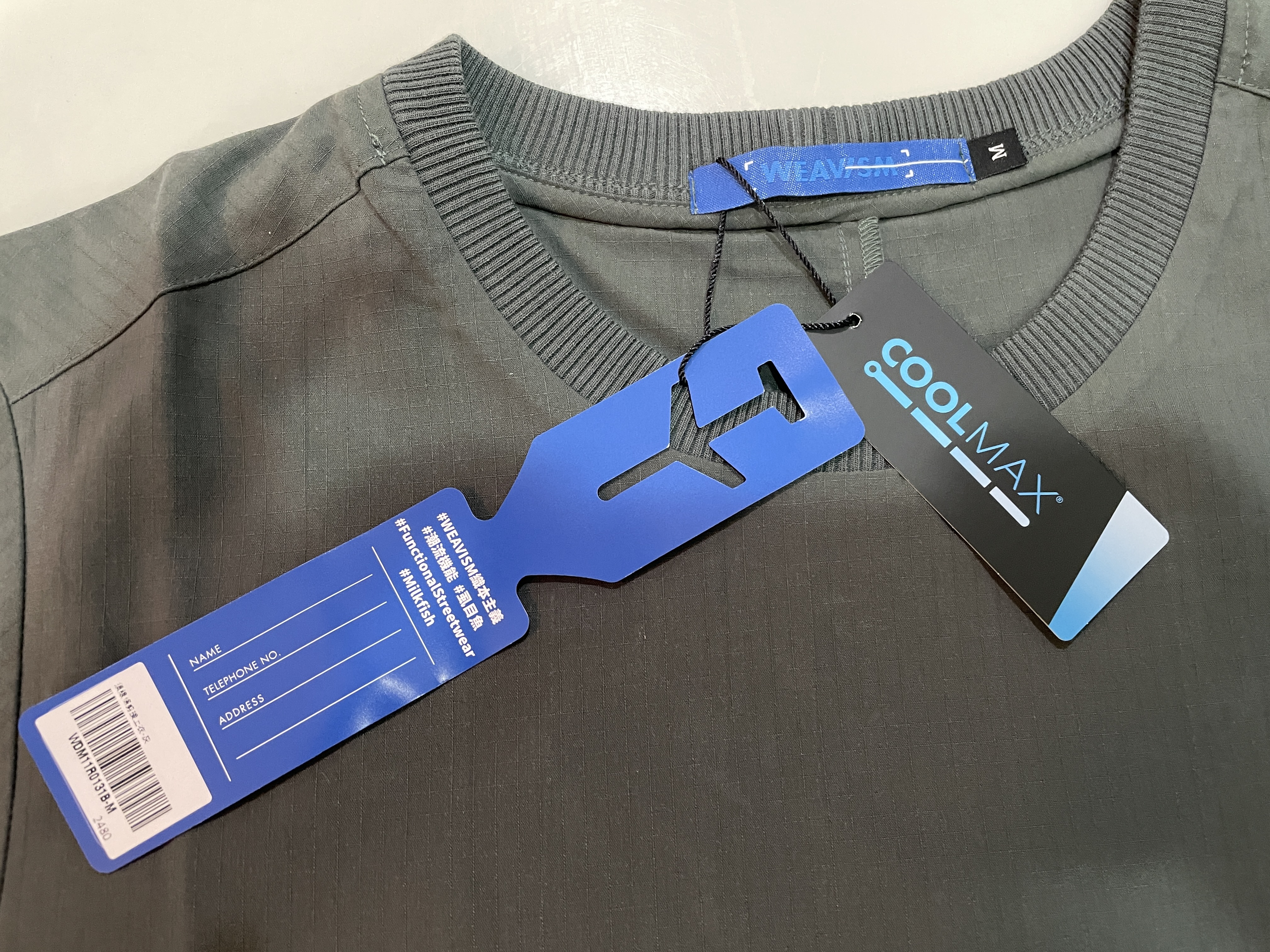 在千挑萬選後,讓我看到一款Tencel的短T,還附加COOLMAX功能,二話不說馬上買下來。這應該是我第一件 Tencel 短 T,本身在紡織業打滾了15年,也知道運動要穿Poly或Nylon布料才容易達到吸濕快乾舒適性,但本人越來越不喜歡穿這些布料的衣服,因為或多或少都有塑膠感,也一直在尋找親膚棉感但同時具備功能性的產品,這件短T剛好有中,而且T-400(彈力紗)高達41%,讓我穿起來活動不緊繃。回家仔細一看,發現連吊牌有小貓膩,居然是登機吊牌設計, 雖然我選中的這件設計較簡潔,但現場各款服飾都看得出來品牌經營者的用心與細心。連台灣生產製造都要標示3次,因為很重要。
